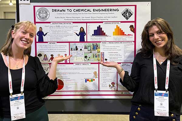 Chemical engineering students Sydnie Bayles, E’27, and Marissa Darcangelo, E’26, were awarded the first-place trophy in the Education and Other category at the AIChE National Student Conference for their poster on “Drawn to Chemical Engineering – Comics As a Visual Learning Tool for First-Year Chemical Engineering Students.”