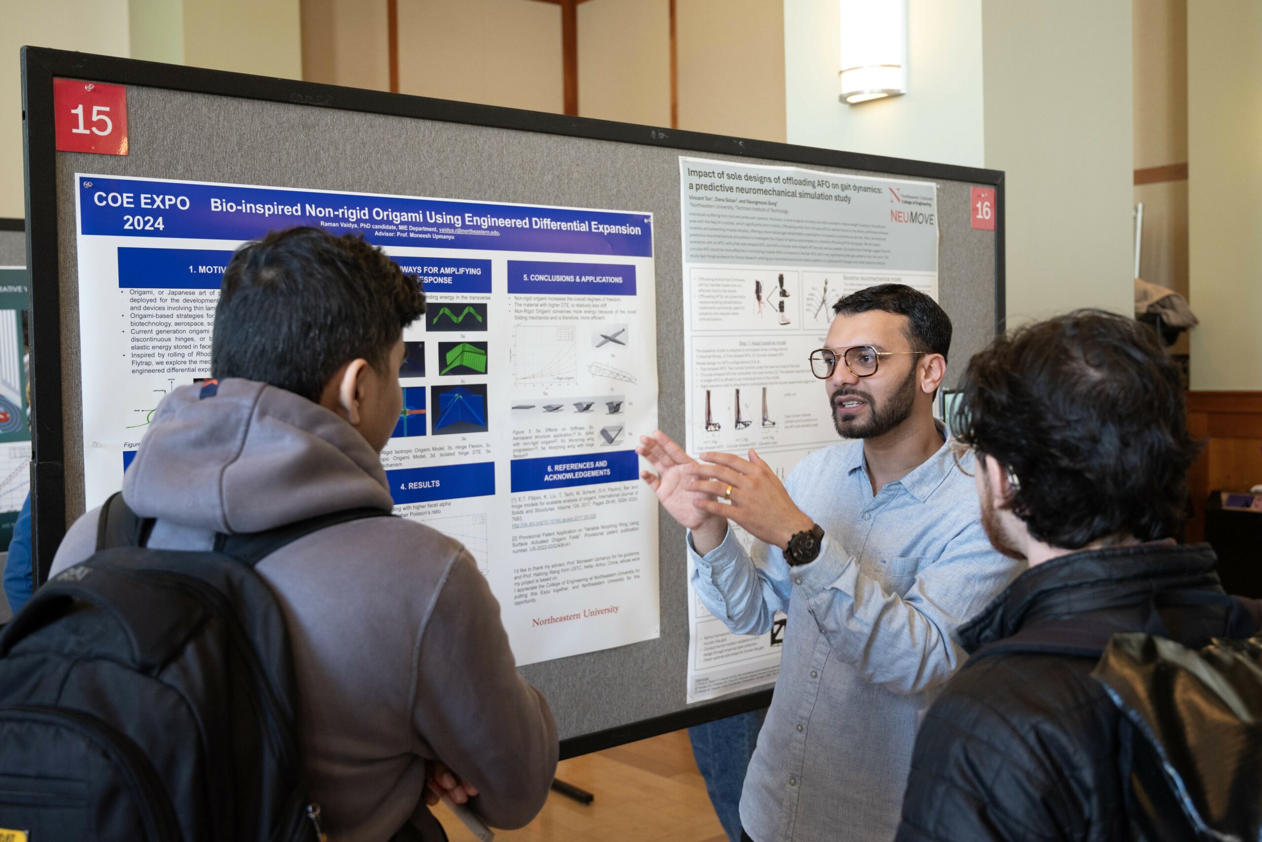 - MIE student Raman Vaidya explains his project to two fellow students.