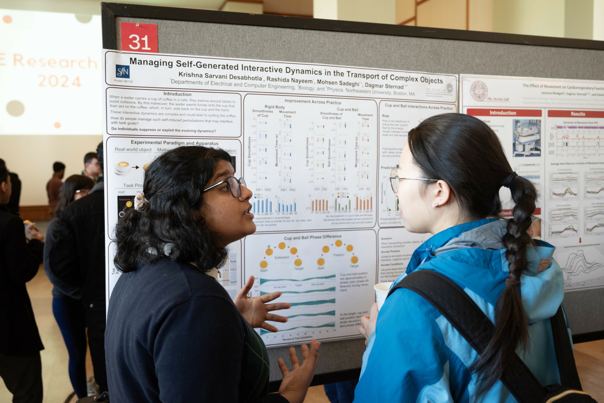 - Krishna Sarvani Desabhotla explains the details of her research project to another student.