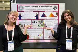 Sydnie Bayles (left) and Marissa Darcangelo (right) presenting their research at AIChE 2025. Photo sourced from LinkedIn.